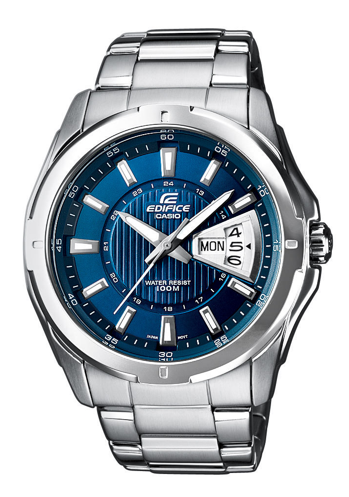 Dieser Herrenchronograph der Marke Casio wird von einem präzisem Quarzwerk angetrieben und hat eine Gehäusebreite von ca. 45 mm. Das Gehäuse selber ist aus hochwertigem Edelstahl hergestellt. Auf dem blauen Zifferblatt lässt sich eine Datums-, sowie Wochentagsanzeige an der 3-Uhr Position finden.