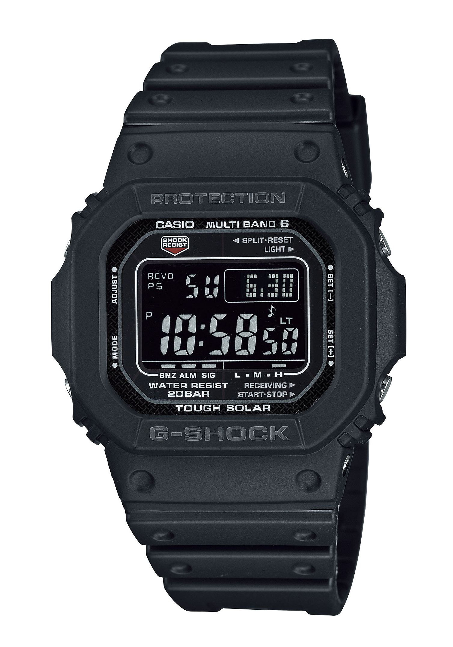 . Auch stellt sich die Uhr dank des Funksignalempfangs in weiten Teilen der Welt automatisch auf die aktuelle Uhrzeit ein und ist somit ein verlässlicher Begleiter im Handgelenk. Das stoßfeste Resingehäuse hat einen Durchmesser von ca. 47 mm, sowie eine Stärke von ca. 13 mm. Auf dem digitalen Zifferblatt lassen sich Anzeigen für die aktuelle Uhrzeit, das Datum, sowie den Wochentag finden. Auch eine Ladekontrollanzeige ist vorhanden. Zusätzliche Funktionen wie fünf individuell einstellbare Tagesalarme sorgen für einen perfekten Überblick im Alltag. Geschützt wird das digitale Zifferblatt von einem kratzresistenten Mineralglas. Ein schwarzes Resingarmband gewährt einen angenehmen Tragekomfort und wird mit einer Dornschließe