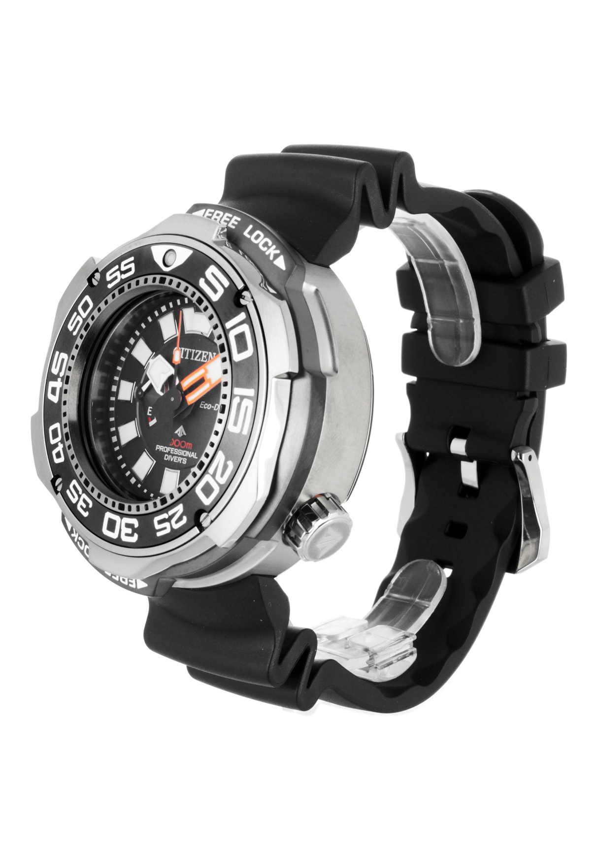 Professional Diver nimmt Ihre Design-Inspiration aus der Form und Struktur einer Turban Muschel. Die Haltbarkeit und Kraft dieser Form wurde bis an die Grenzen getestet. Auf dem schwarzen Zifferblatt befindet sich ein Citizen Logo. Die Zeiger und Indizes