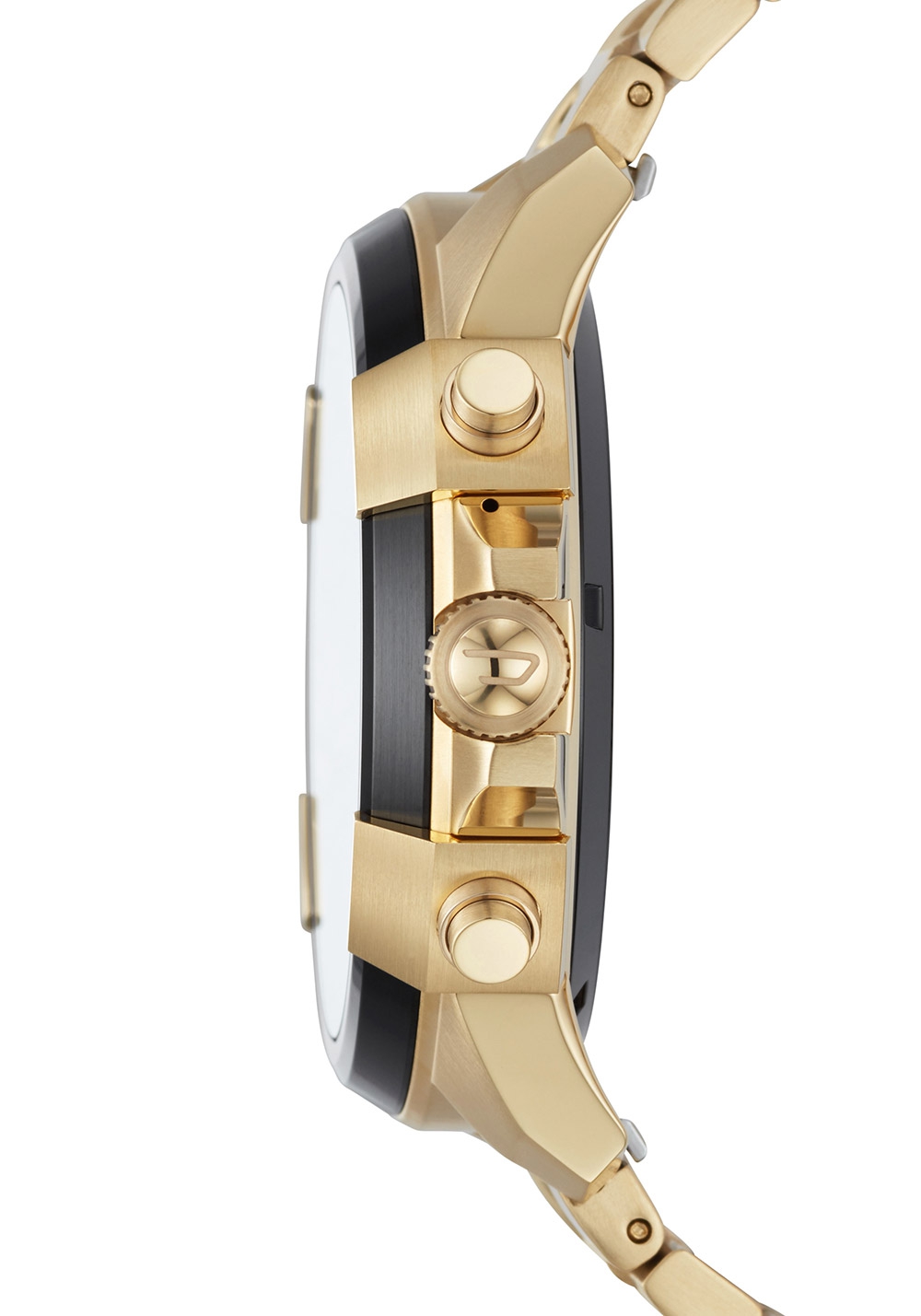 Ein Gliederarmband aus hochwertigem, goldfarben beschichteten Edelstahl gewährt einen angenehmen Tragekomfort.