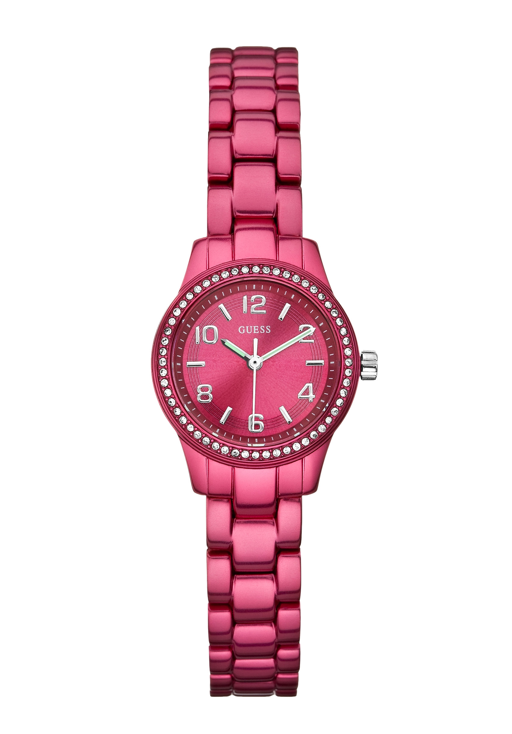 Das Ziffernblatt ist pink mit silberfarbenen Ziffern und Indizes