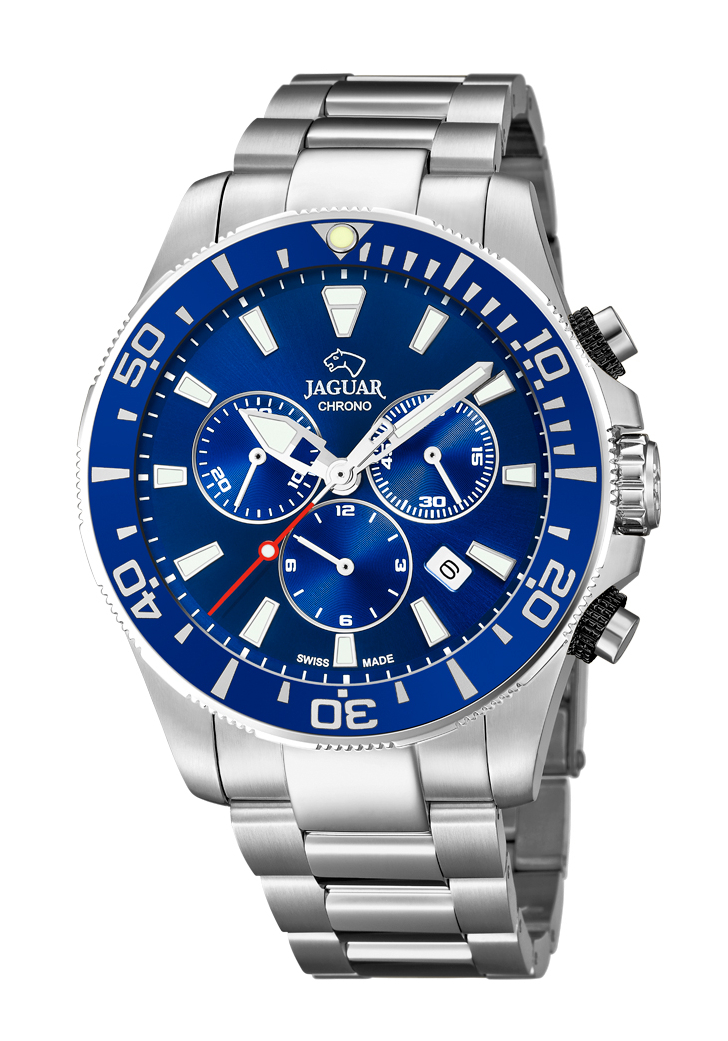 Auf dem dunkelblauen Zifferblatt befindet sich ein Jaguar Logo.