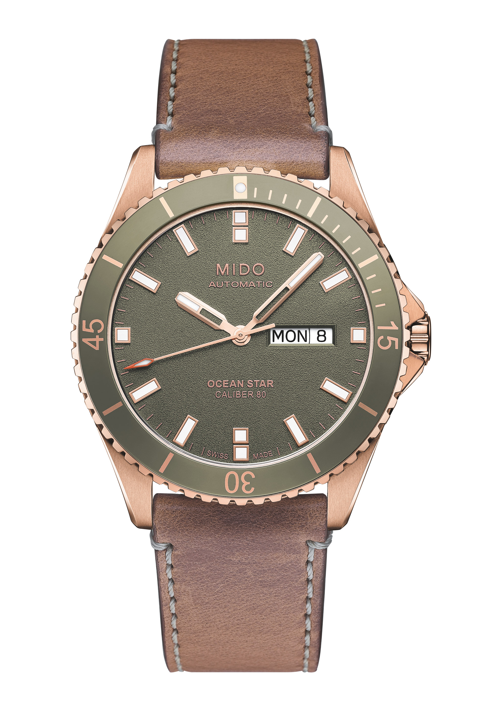 Das olivgrüne Zifferblatt besitzt eine feine Körnung und bildet einen schönen Kontrast zur Gehäusefarbe.