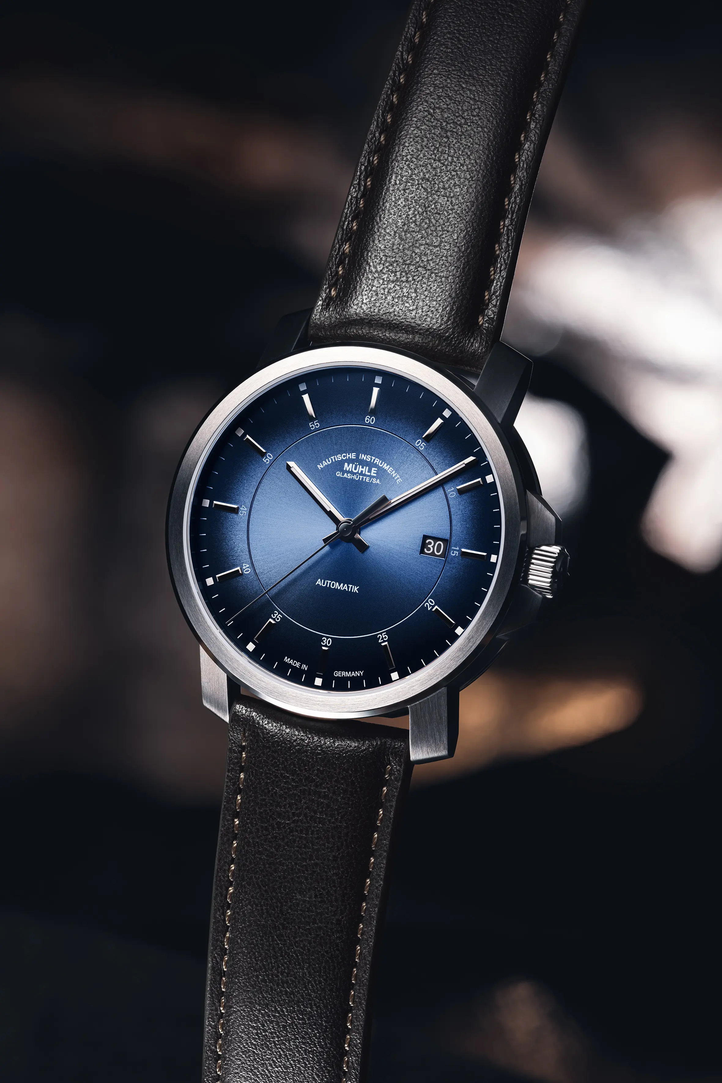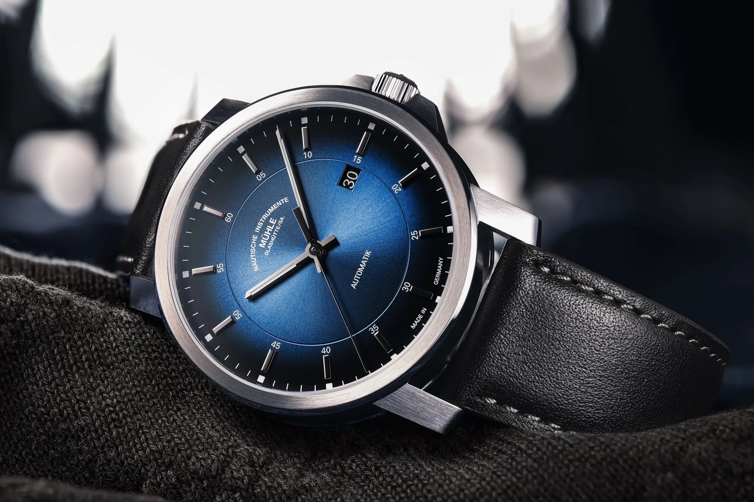 Mit einer Gehäusehöhe von gerade einmal 9,75 mm und einem Durchmesser von rund 42,4 mm zählt die 29er Casual zu den aktuell flachsten Uhren von Mühle Glashütte. Das neue küstenblaue Zifferblatt mit faszinierendem Strahlenschliff lässt die Uhr je nach Lichteinfall in verschiedensten warmen Blautönen erstrahlen. Ein hochwertiges Edelstahlgehäuse fasst das kratzfeste, entspiegelte Saphirglas