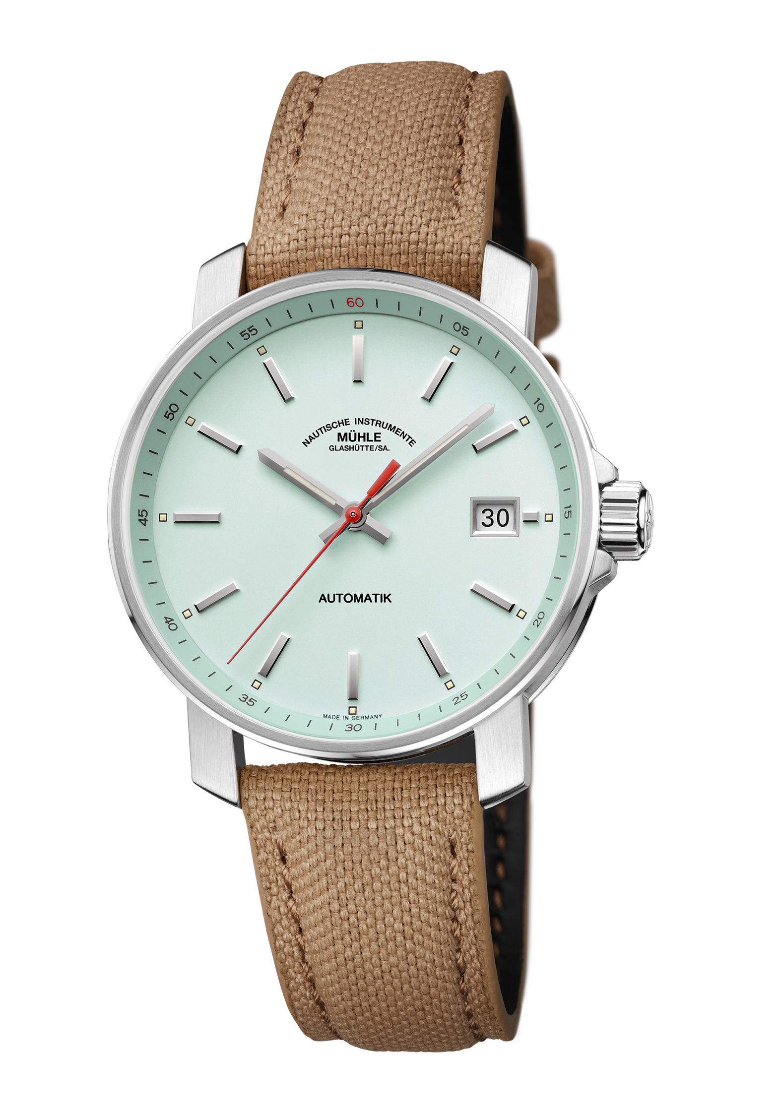 verbirgt sich ein mintfarbenes Zifferblatt mit Datumsanzeige auf 3 Uhr. Die applizierten Zeiger und Stundenmarkierungen sind mit Super-LumiNova belegt und ermöglichen so ein Ablesen der Uhrzeit in schwierigen Lichtverhältnissen.
