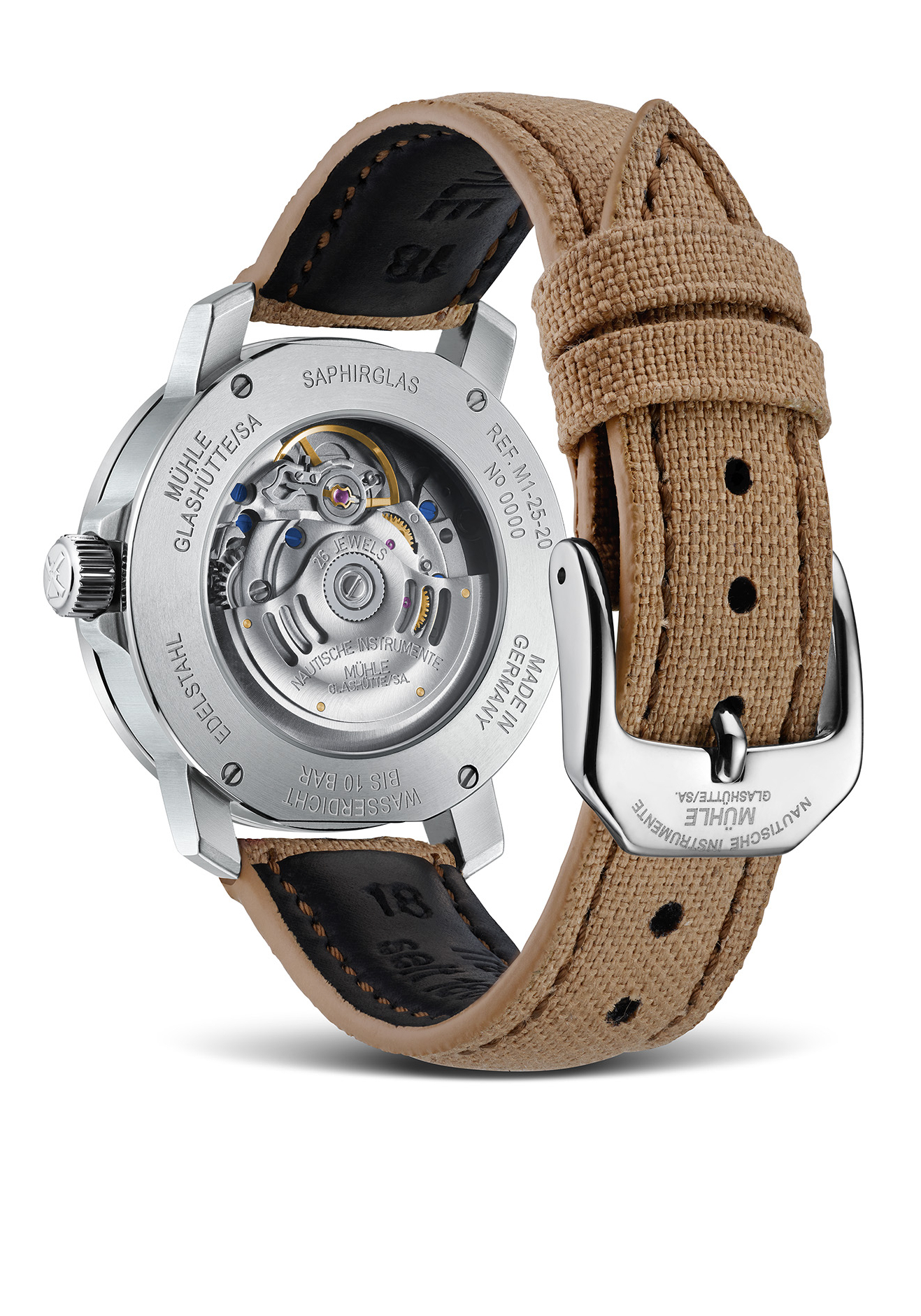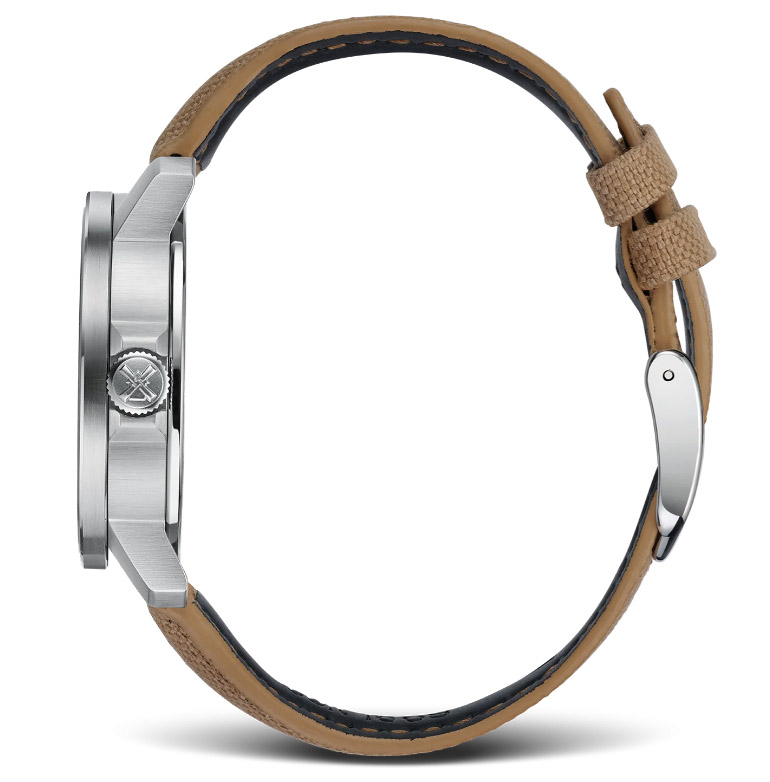 Die Uhr wird an einem sandfarbenen Canvasband (18 mm) mit Faltschließe
