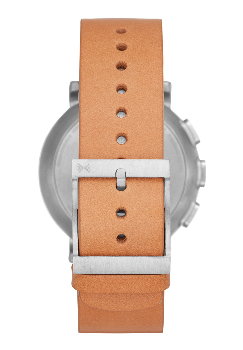 Ein hochwertiges, braunes Lederarmband gewährt einen angenehmen Tragekomfort.