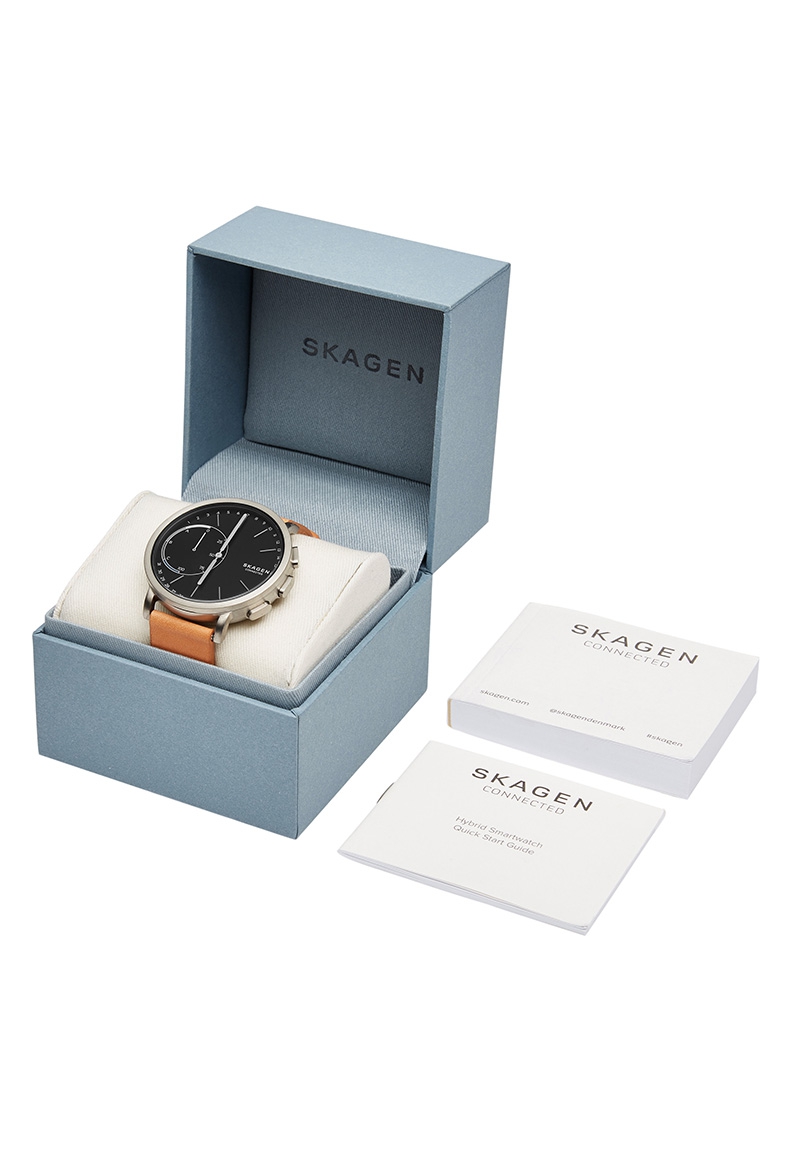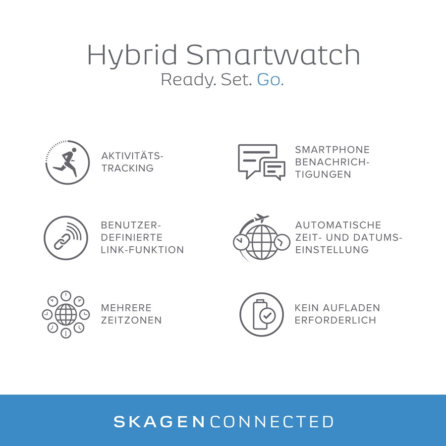 Die Skagen Connected Uhr Hagen ist kompatibel mit Android Smartphones 4.4+ und iPhone 5+/iOS 8+ und synchronisiert sich drahtlos mit dem Smartphone über die SKAGEN App, mit der man seine Daten einsehen und persönliche Einstellungen vornehmen kann.