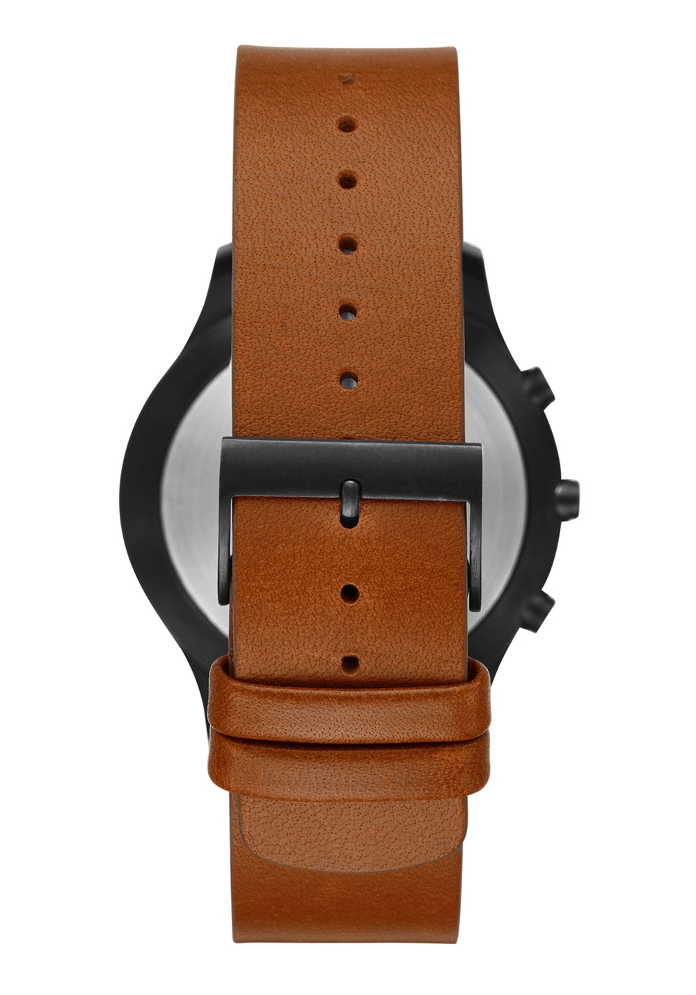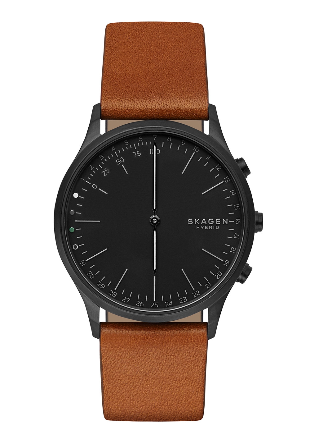 Auf dem schwarzen Zifferblatt befindet sich ein Skagen Logo.