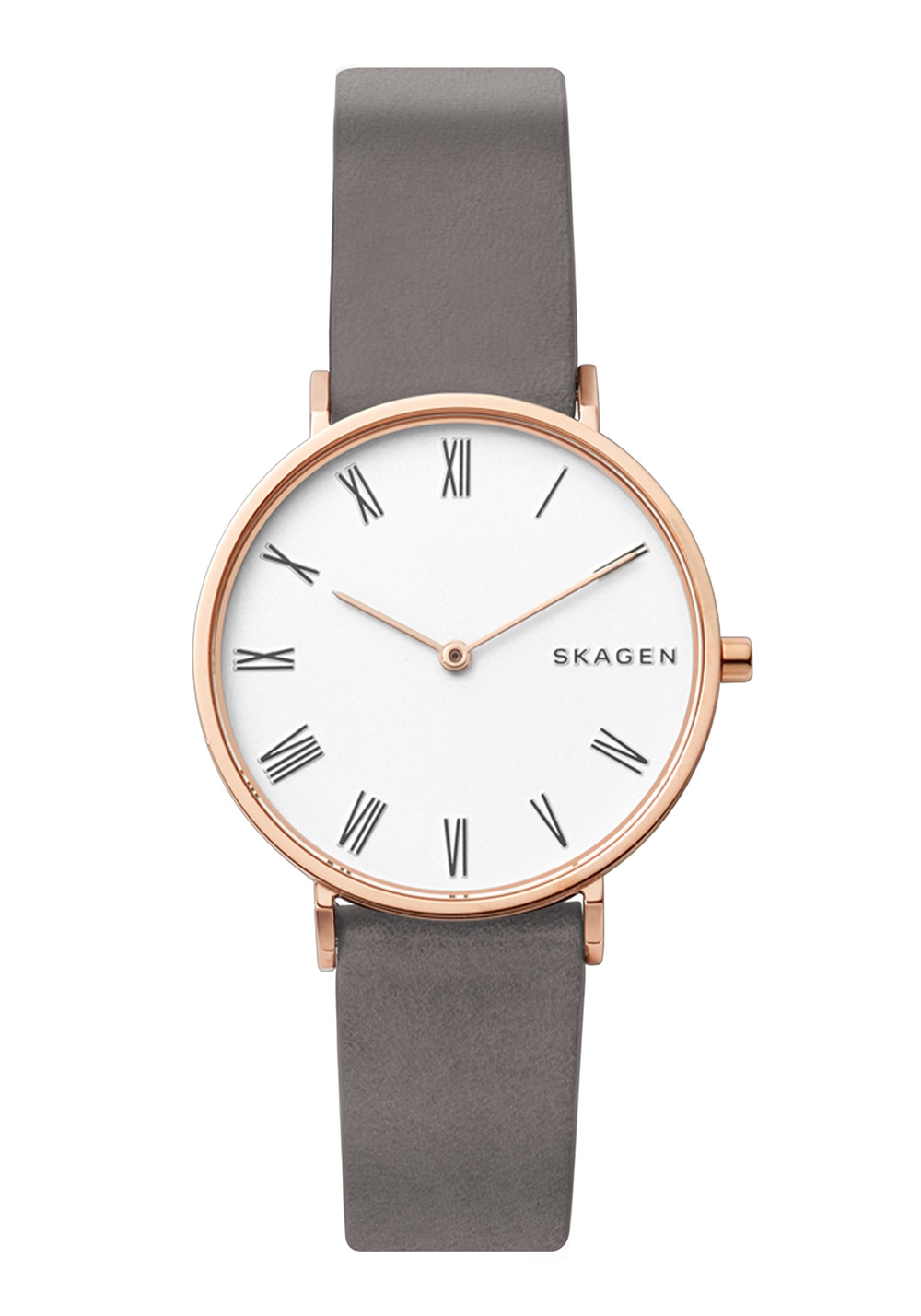 Auf dem weißen Zifferblatt befindet sich ein Skagen Logo.