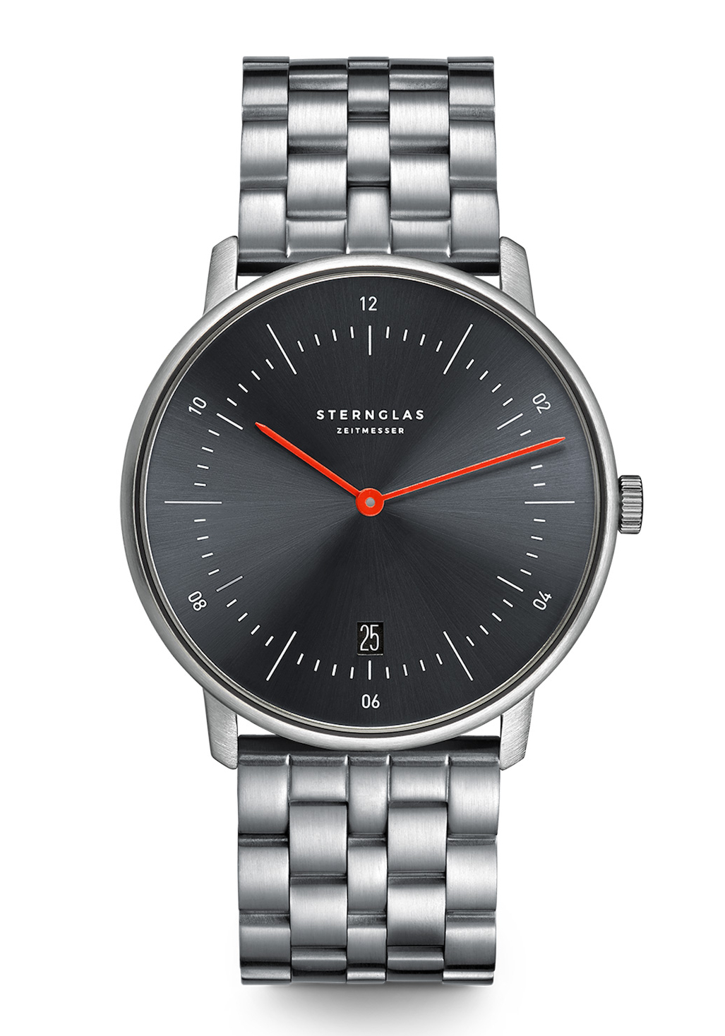 Dieser elegante Zeitmesser der Marke STERNGLAS ist im Bauhaus-Stil gehalten und wird so zum klassischen Begleiter am Handgelenk des modernen Mannes. Das Gehäuse eignet sich dank der Höhe von gerade mal 6 mm optimal für alle Herren, die gerne morgens zum Hemd greifen und eine Uhr suchen, die ihr Outfit perfekt ergänzt. Gefertigt ist das Gehäuse aus hochwertigem Edelstahl und hat einen Durchmesser von ca. 38 mm. Das anthrazitfarbene Zifferblatt ist, wie für den Bauhaus-Stil typisch, sehr schlicht gehalten. Die beiden roten Zeiger lockern das Zifferblatt auf und sorgen für einen Eyecatcher. Auf der 6-Uhr-Position befindet sich die Datumsanzeige, die sich als nützliche Funktion erweist. Ein gewölbtes Saphirglas