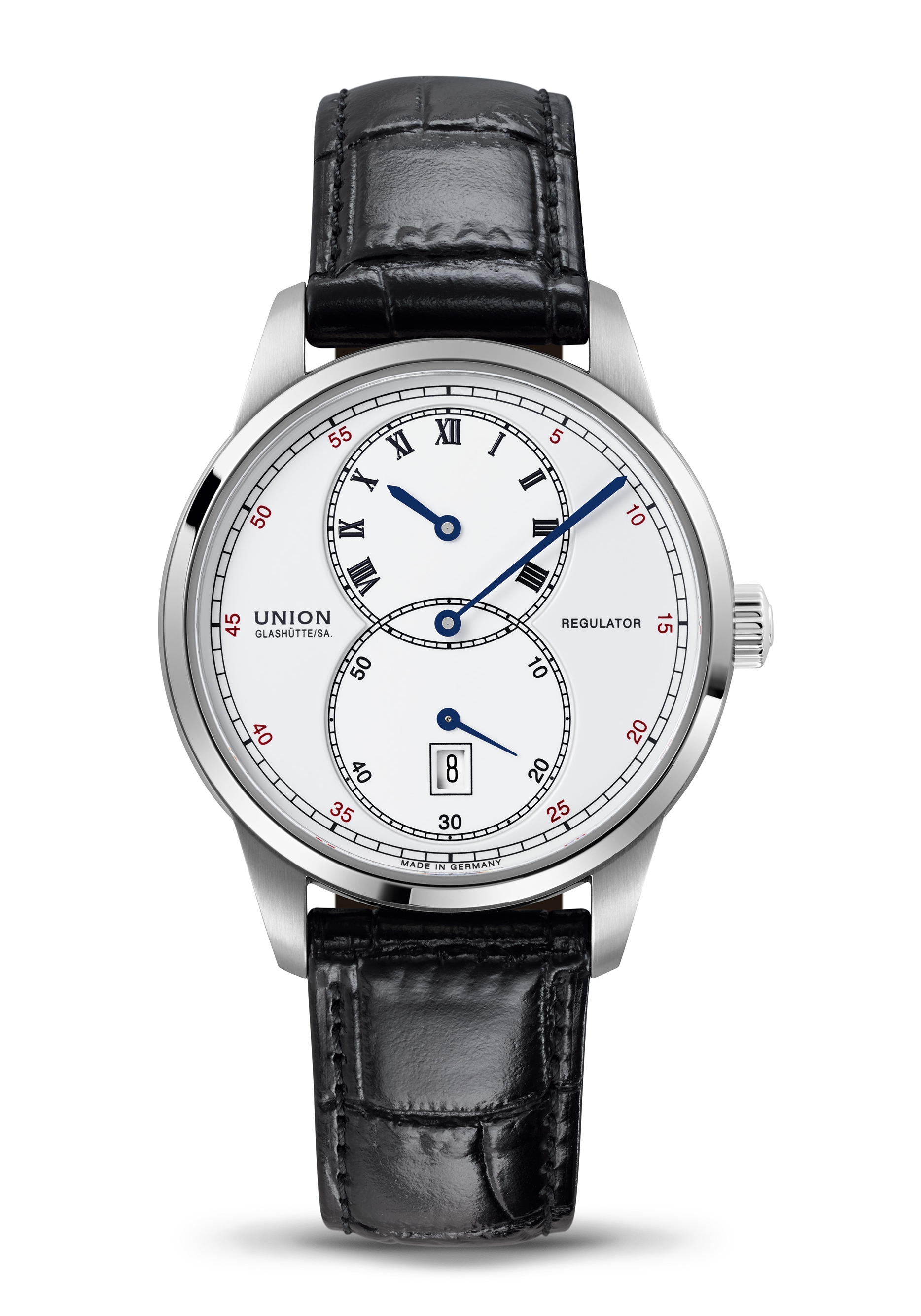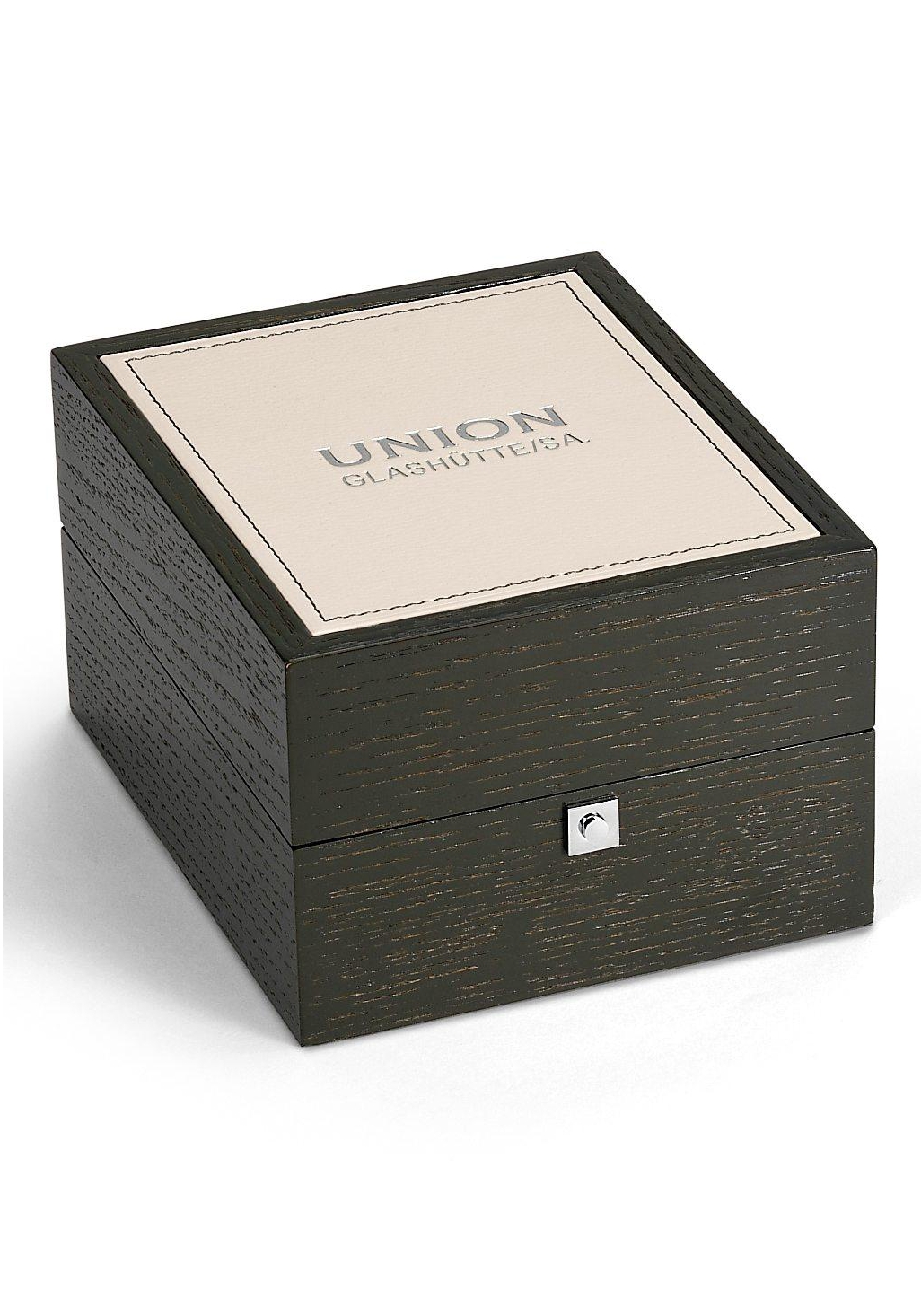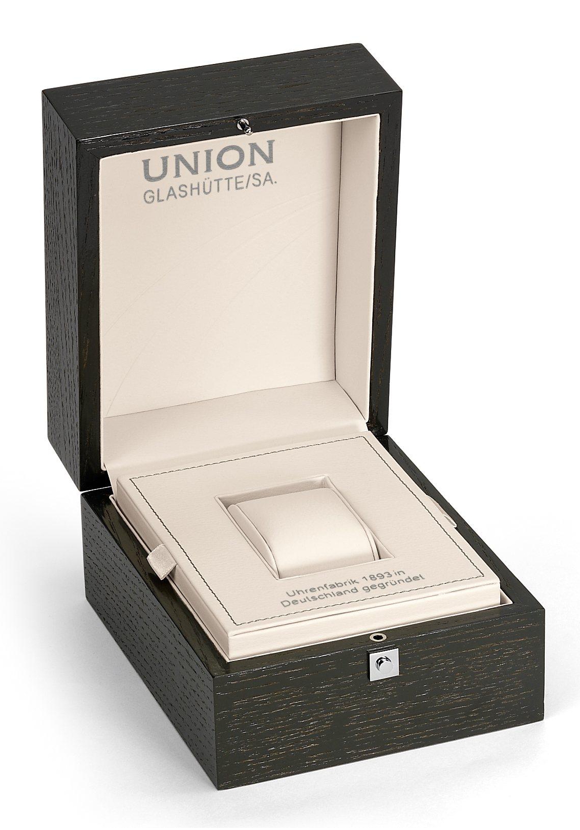 Auf dem formschönen, weißen Zifferblatt befindet sich ein dezentes Union Glashütte S.A. Logo.