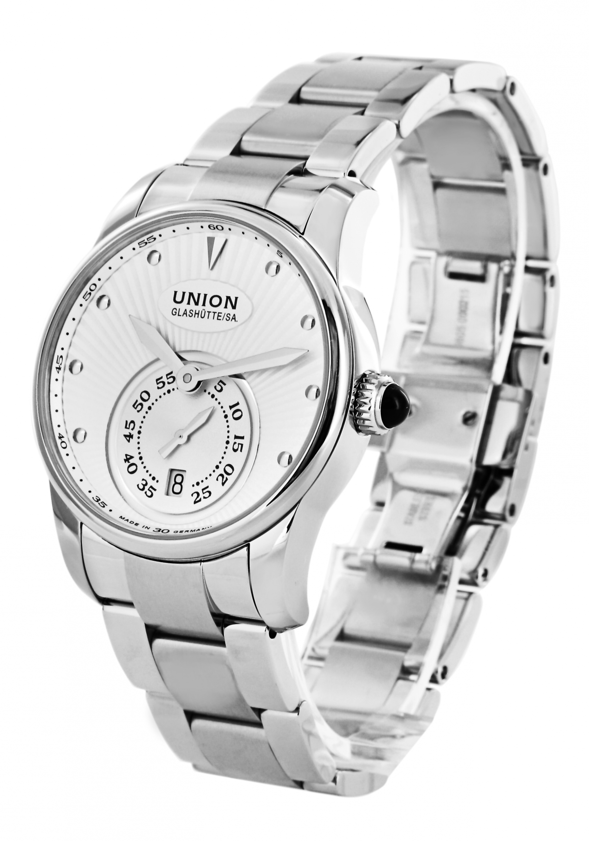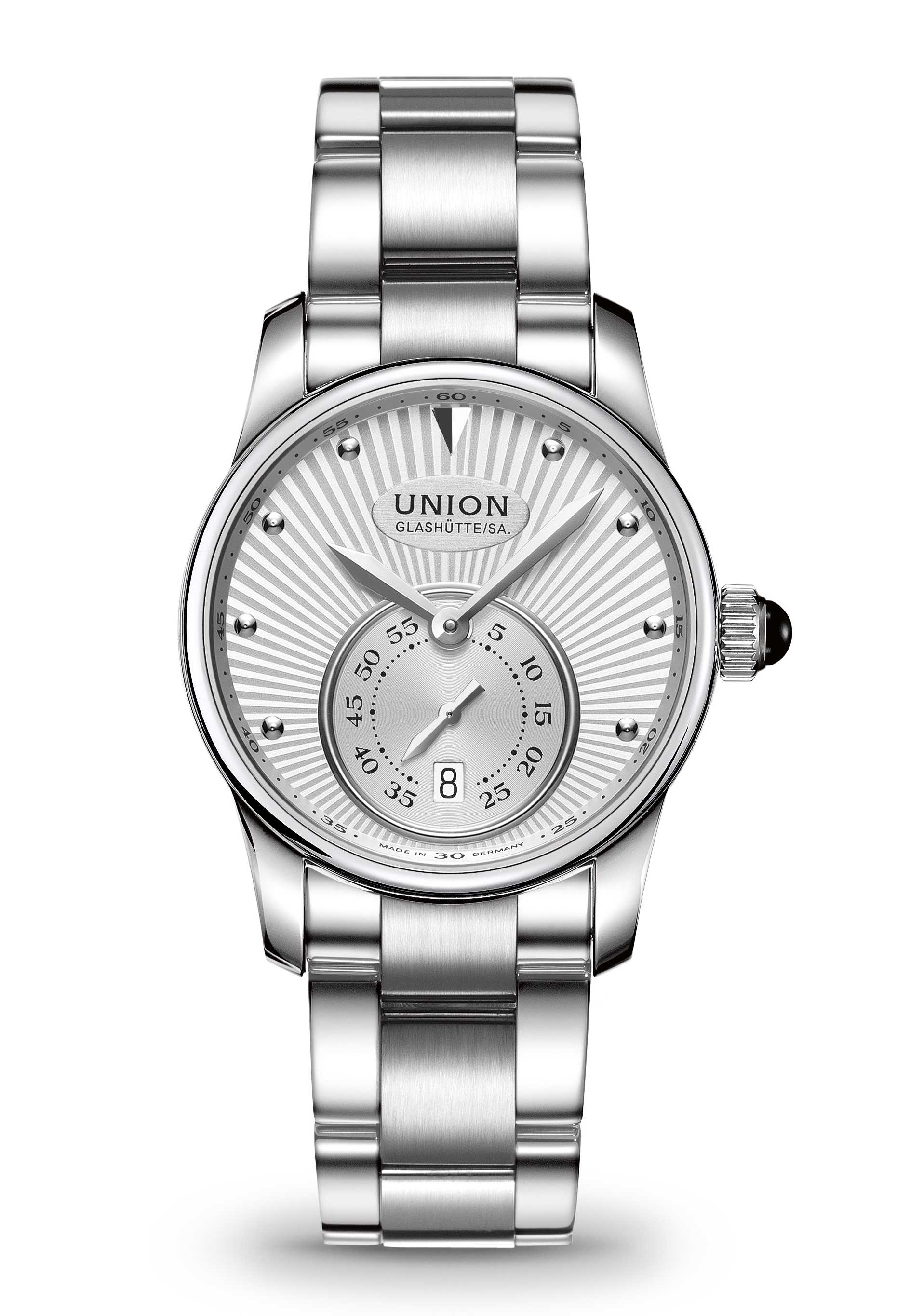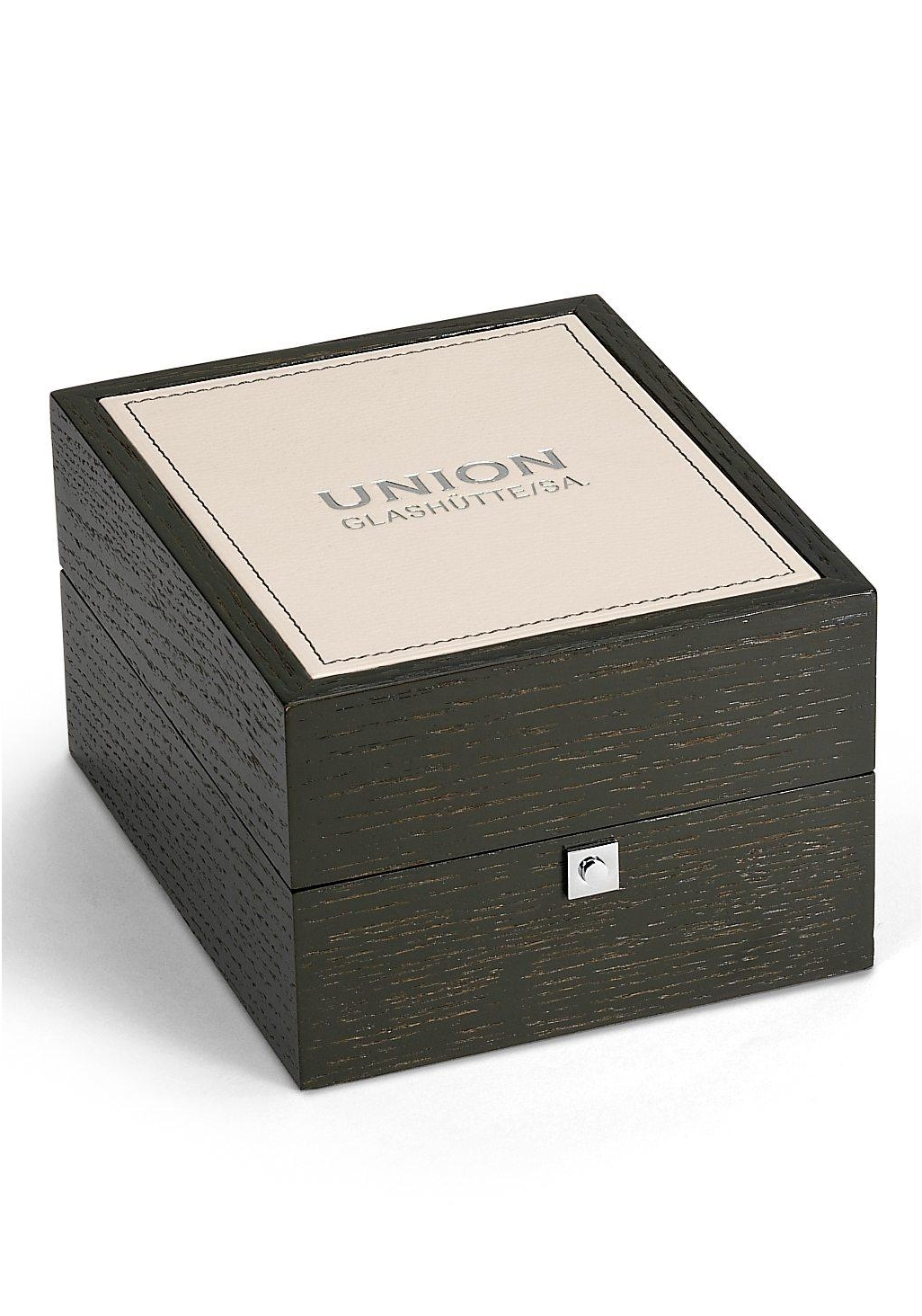 Auf dem formschönen, strukturierten Zifferblatt befindet sich ein dezentes Union Glashütte S.A. Logo.