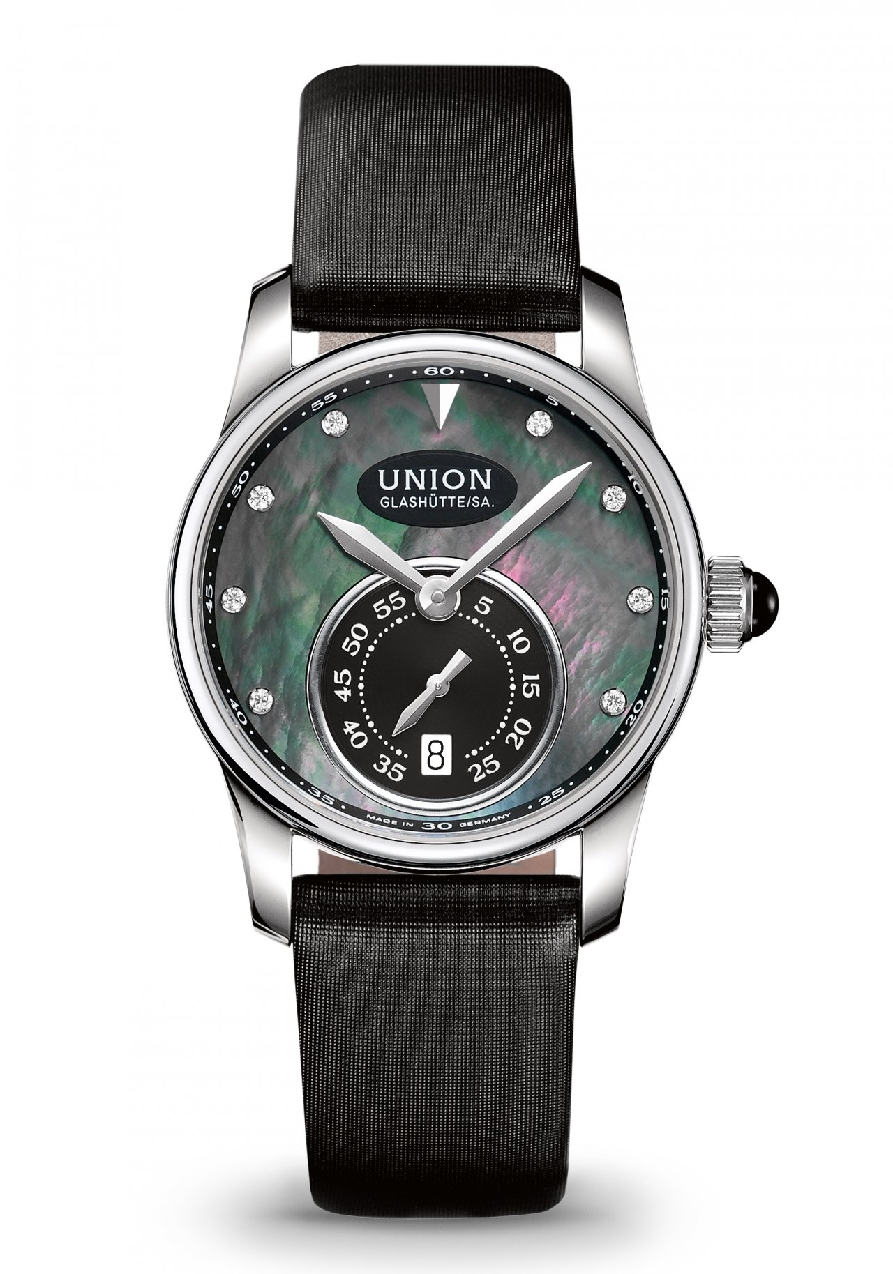 Auf dem formschönen, Perlmutt Zifferblatt befindet sich ein dezentes Union Glashütte S.A. Logo.